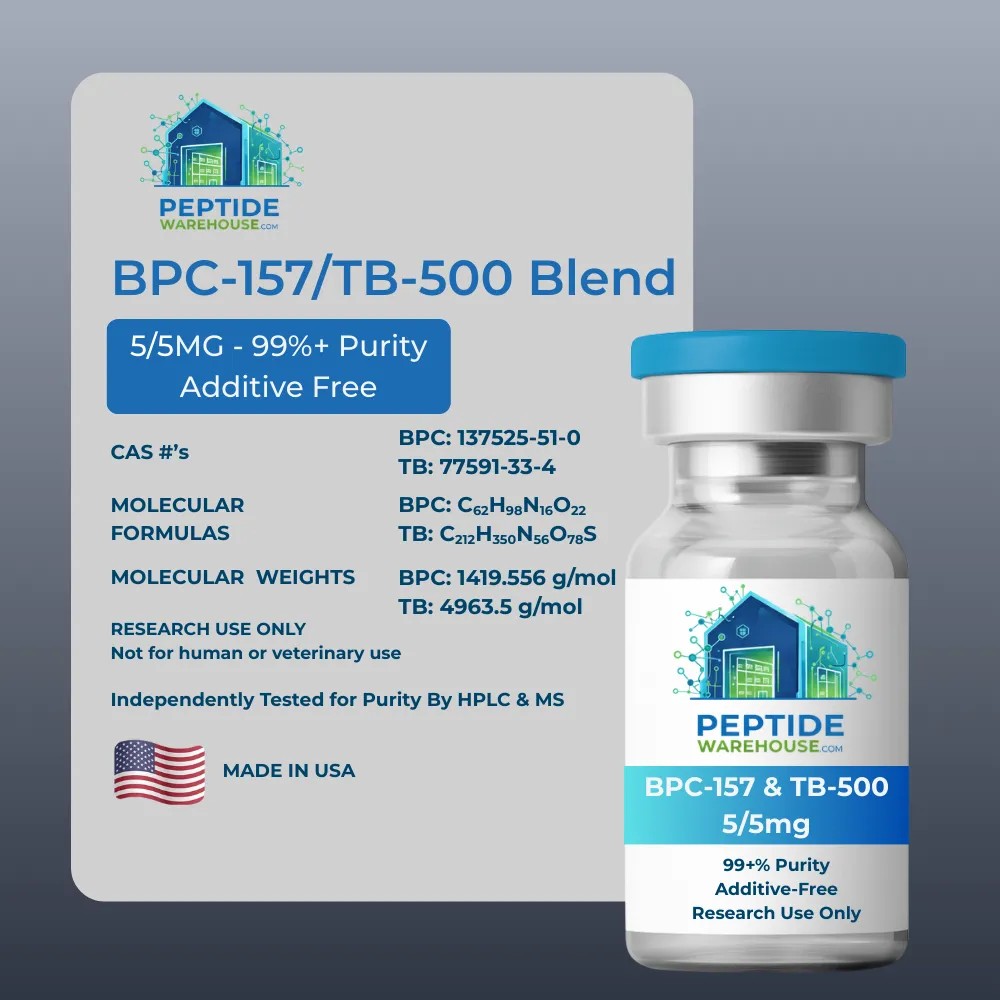 This blend contains two research-grade peptides—BPC-157 and TB-500—combined in a single lyophilized vial for controlled laboratory studies investigating complementary biochemical pathways. BPC-157 has been examined in peer-reviewed literature, including mechanistic findings referenced under PubMed ID: 25924990, describing its influence on angiogenic and cytoprotective pathways. TB-500, a synthetic analog of thymosin beta-4, is widely used to study actin-binding protein interactions, cytoskeletal organization, and cellular migration processes.