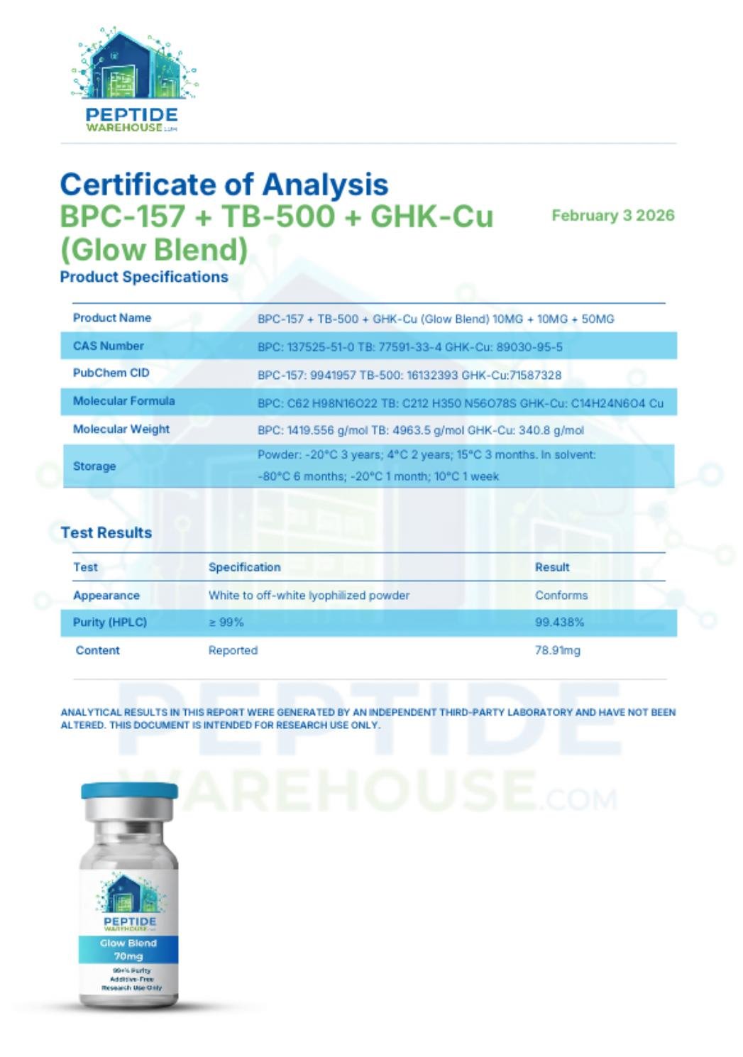 The Glow Blend is a three-peptide research combination consisting of BPC-157, TB-500, and GHK-Cu. This multi-pathway formulation integrates peptides that have individually been documented in peer-reviewed literature, including GHK-Cu studies indexed under PubChem CID: 5311056 and PMID: 17114640, highlighting its role in copper-dependent enzymatic and tissue regeneration signaling mechanisms. The blend is intended for controlled laboratory studies examining cellular repair processes, fibroblast regulation, cytoskeletal dynamics, peptide–copper interactions, and extracellular matrix modulation.
