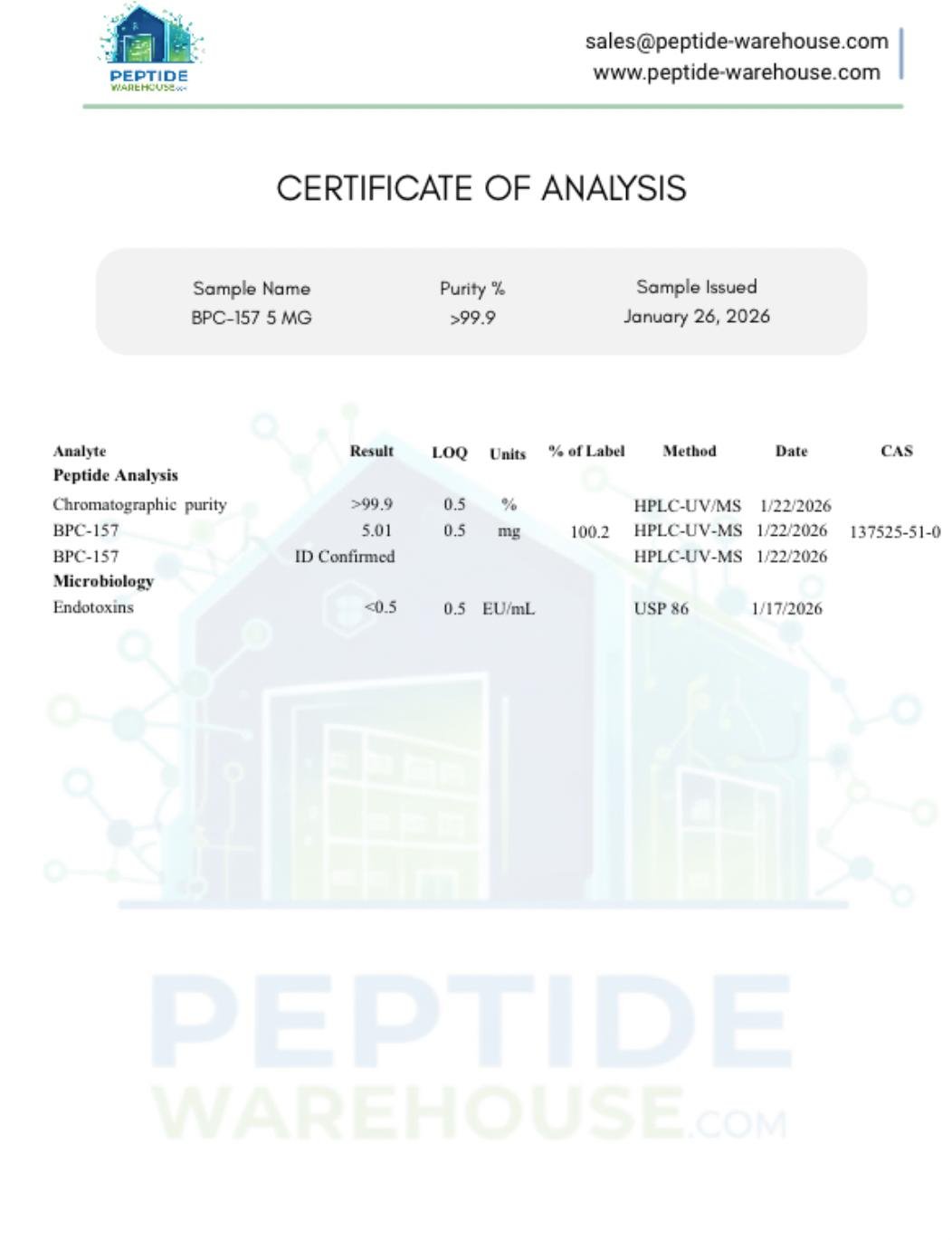 BPC-157 (Body Protection Compound-157) is a synthetic peptide fragment derived from a naturally occurring protein found in human gastric juice. Peer-reviewed literature, including mechanistic analysis indexed under PubMed ID: 25924990, describes its relevance in the study of cytoprotective and angiogenic biochemical pathways. In controlled laboratory environments, BPC-157 is utilized to investigate cellular repair mechanisms, angiogenic signaling circuits, nitric oxide–modulated interactions, and peptide-mediated regulatory processes. Its high stability and reproducibility in vitro make BPC-157 a widely utilized tool in mechanistic assays involving fibroblast activity, growth-factor–linked biochemical pathways, and receptor-binding investigations. Due to its broad pathway interactions, BPC-157 remains a significant molecule for in-vitro peptide-based research models.