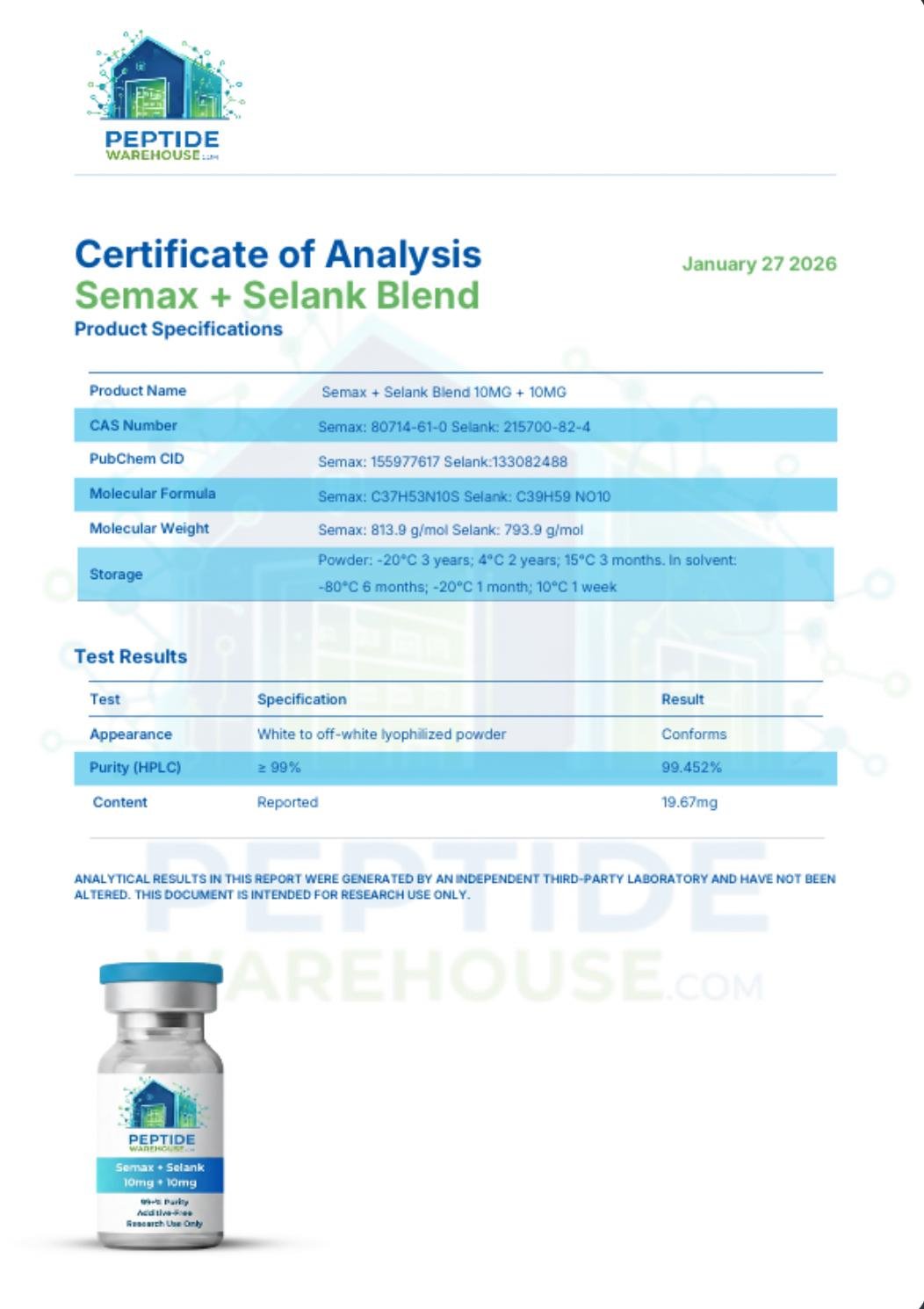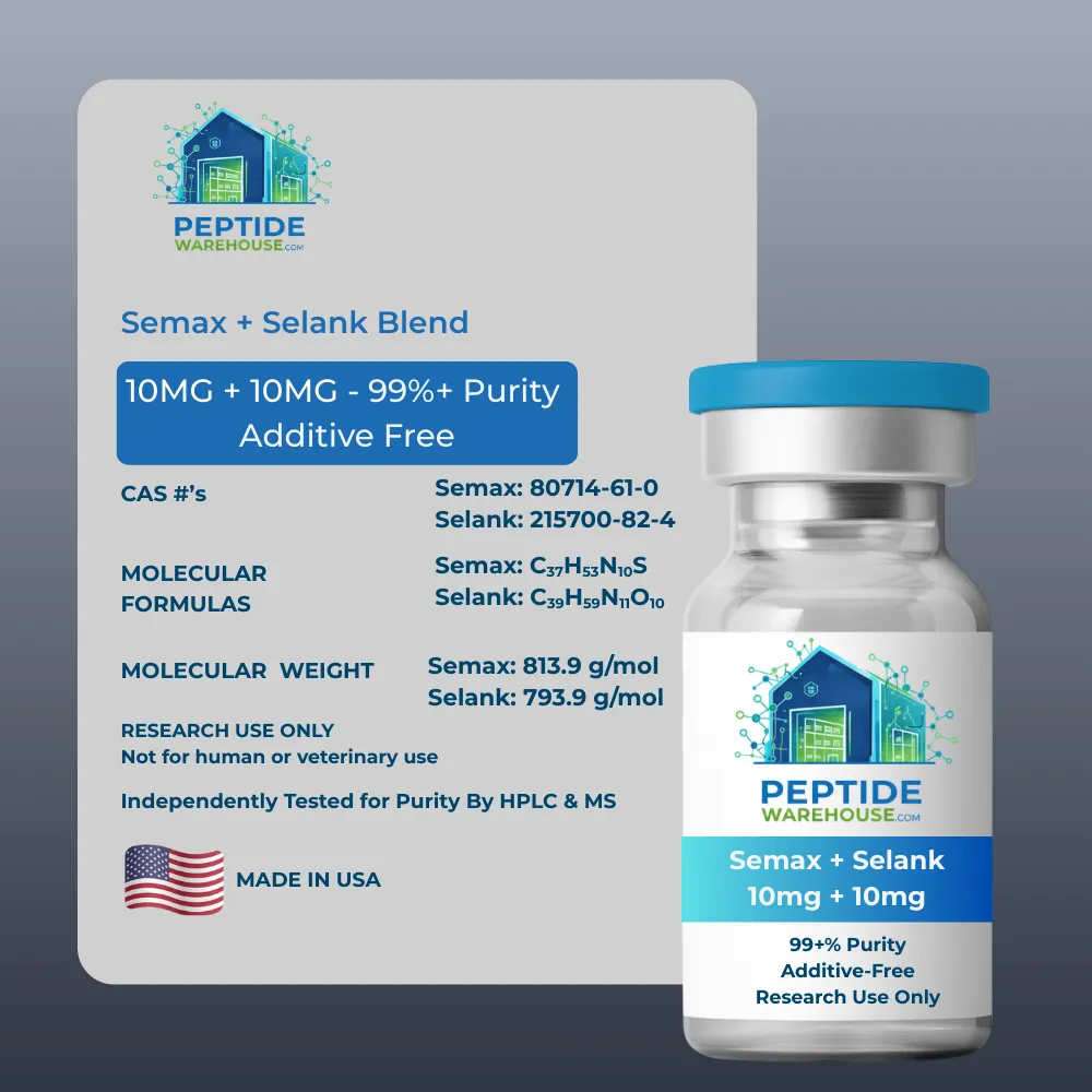 The Semax + Selank blend is a synthetic combination of two well-characterized neuropeptides originally developed as analogs of endogenous regulatory peptides. Semax is derived from adrenocorticotropic hormone (ACTH) fragments, while Selank is a modified analog of the immunomodulatory peptide tuftsin. When combined, these peptides provide a defined molecular system for studying peptide–receptor interactions, signal transduction pathways, and structure–function relationships within neurochemical and neuroimmune research models.
