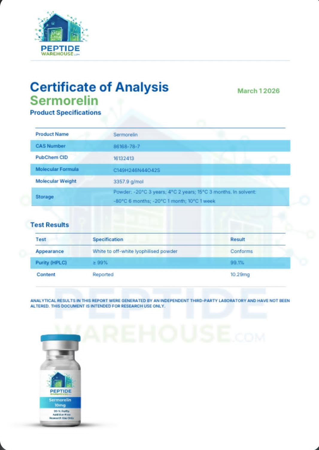 Sermorelin is a synthetic peptide corresponding to the first 29 amino acid residues of endogenous human growth hormone–releasing factor (GRF). As a truncated fragment, it retains the core structural features required for receptor interaction while remaining distinct from full-length regulatory proteins. In laboratory research settings, Sermorelin is utilized as a reference material for studying GRF-mediated signaling behavior, peptide–receptor interaction models, and comparative analyses involving growth hormone–releasing peptides.